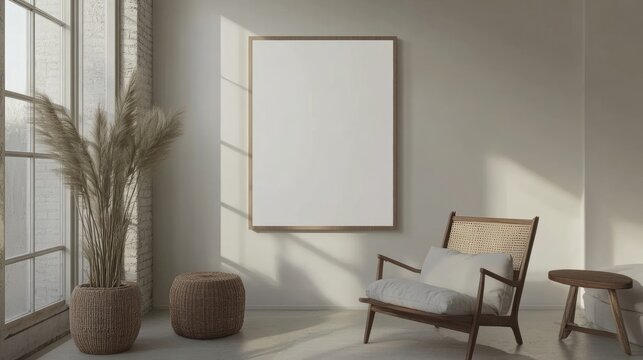 White poster mock up displayed in a contemporary living room with Scandinavian design, featuring a clean aesthetic, ample white space, and a modern vibe ideal for creative projects.
