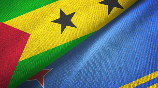 Sao Tome and Principe and Aruba two flags textile cloth, fabric texture
