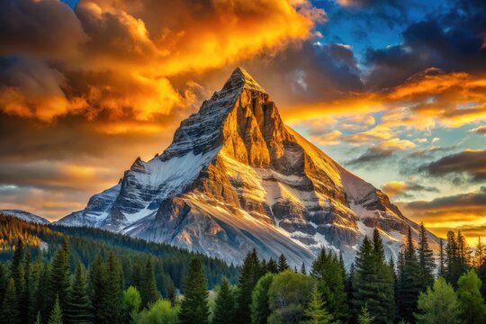 A Majestic Mountain With A Distinct Conical Peak Bathed In Golden Sunlight Against A Vibrant Sky