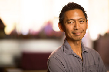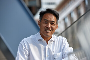 Asain elderly woman smiling and looking at camera while standing in a garden