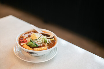 Delicious Curry Laksa Soup Bowl with Noodles and Fish Balls