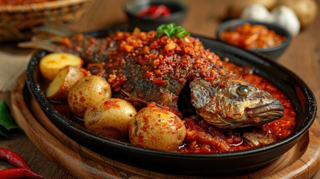 Tilapia fish cooked in spicy Asam Padeh style alongside potatoes on a wooden table, highlighting traditional seafood preparation