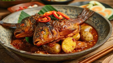 Spicy Asam padeh tilapia fish and potatoes on a wooden table