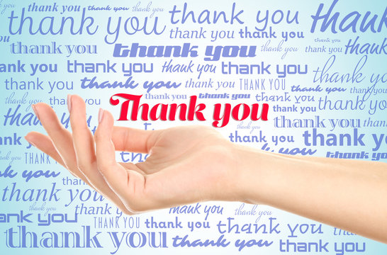 Thank You Words Tag Cloud. Man presses button thank you word button on virtual screen.