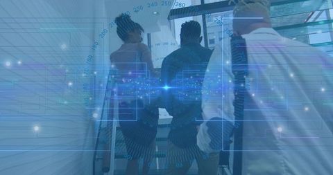 Colleagues ascending glass stairway with blue hud overlay showing teamwork and innovation
