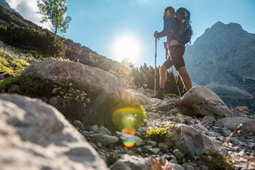Mature couple hiking rocky trail with backpacks and trekking poles