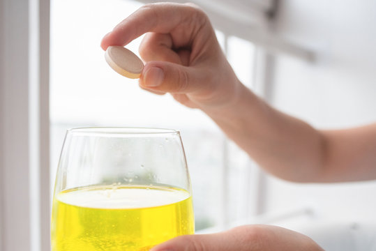 Vitamin C effervescent tablet dissolving in a glass of water, with a bottle and loose tablets on a wooden surface.