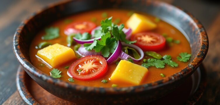 Closeup of sayur asem a tangy veggie soup. Indonesian dish with tamarind base. Bowl with mango cubes tomato slices onion rings and herbs is rich with vitamins.