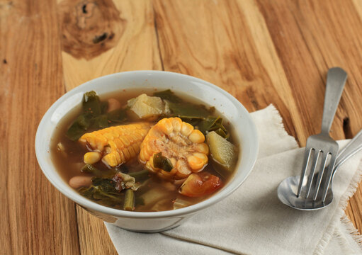 Mixed vegetable tamarind called sayur asem featuring leafy greens, corn, and potato pieces in a rich broth. Cozy, wholesome meal set on a wooden table