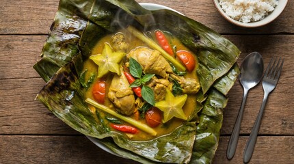 Indonesian Traditional Food Garang Asem Ayam Steamed Chicken in Banana Leaf