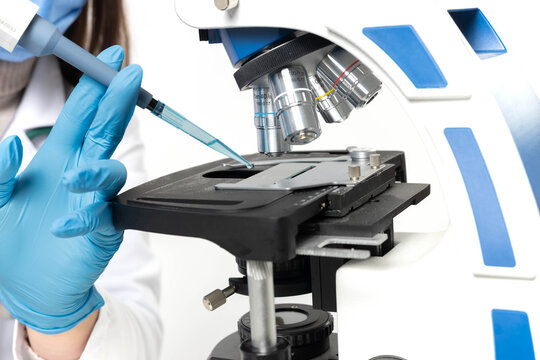 A professional conducting scientific experimentation with tools and equipment in a sterile environment using a microscope