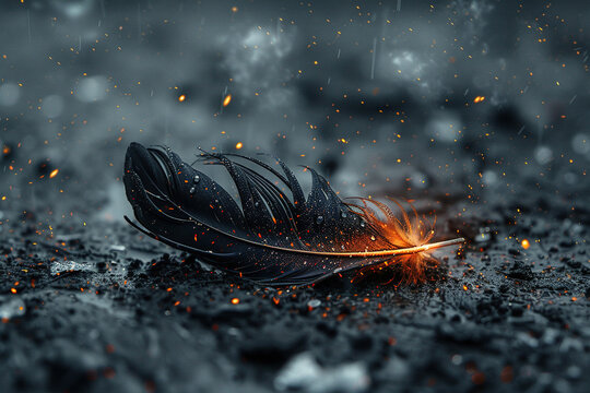 Black feather with sparks of fire on an ashen surface with a blurred background. Generated by artificial intelligence