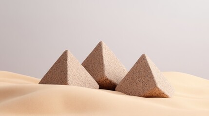 Pyramidal rock formations in ashen tones standing on soft dunes, surreal lunar terrain feel