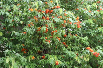 Ashoka tree and flowers blooming on branch with leaves in Thailand. In the past Ashoka's flowers are ingredient of Thai curry.