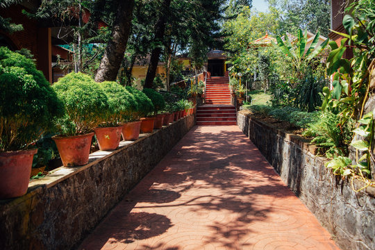 Walkway in tropical garden in indian yoga ashram