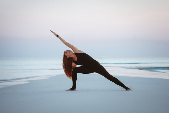Summer yoga session on a beautiful golden beach of Maldives yoga tour, Extended Side Angle Pose Utthita Parsvakonasana