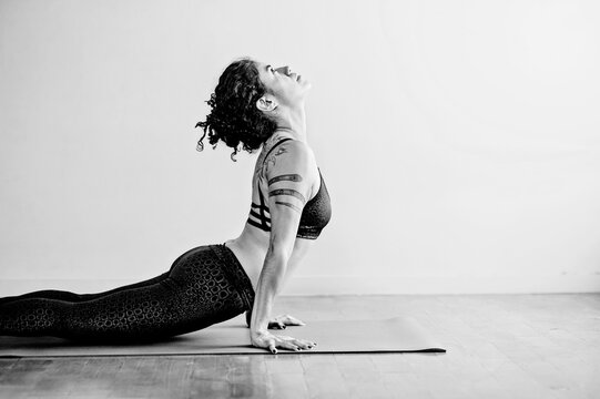 Sporty beautiful young woman practicing yoga, doing half push up or Ashtanga Namaskara from Sun salutation. Side view