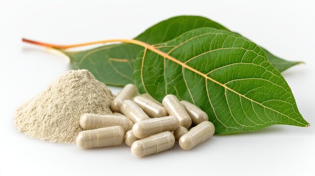 Ashwagandha capsules set against a white background with copyspace for promotional use