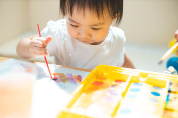 Asian child using colourful simplistic artificial intelligence on virtual screen with simple minimalist colourful UI for education - future education concept, virtual classroom