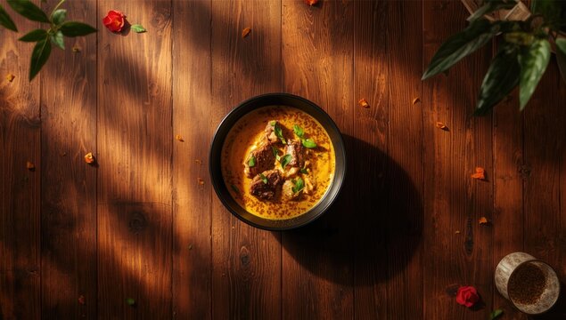 Overhead shot of lamb curry in a bowl highlighting ingredients and preparation, culinary appreciation