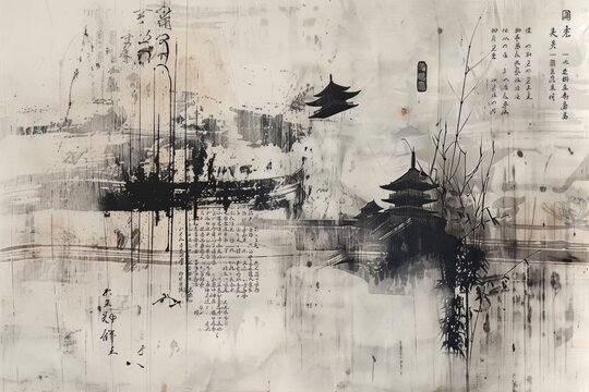 A painting of a city with a lot of writing in Chinese. The mood of the painting is serene and peaceful
