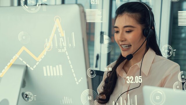Asian Call Center Agent Analyzing Financial Data On Headset Images