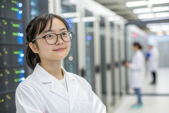 A young woman wearing glasses and a lab coat stands with her arms crossed in a data center. Rows of servers illuminate the background, showcasing a high tech environment during work hours.