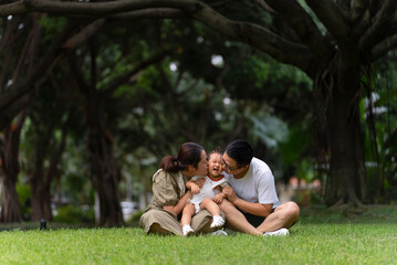 Portrait of enjoy happy love asian family father and mother holding cute little asian girl child smiling playing and having fun moments good time in summer park at home
