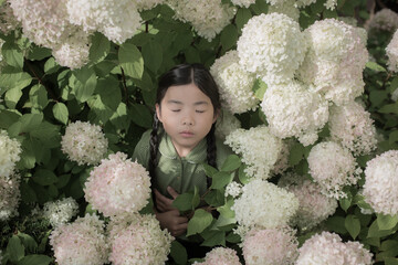 portrait of an asian girl standing within white hortensia  flowers bush in garden