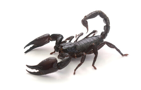 Asian giant forest scorpion (Heterometrus laoticus) on white background. H. laoticus is a member of giant forest scorpions (Heterometrus sp.) found in tropical and subtropical southeast Asia.
