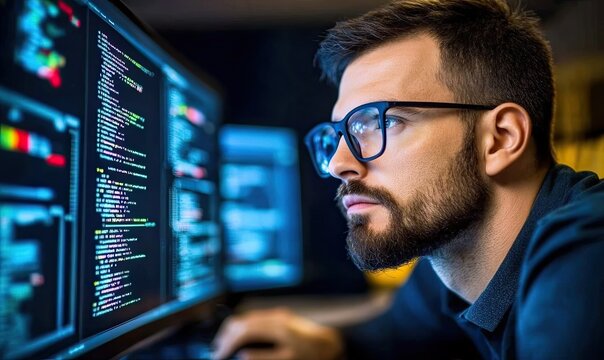 Focused hacker in data terminal with cybersecurity interface