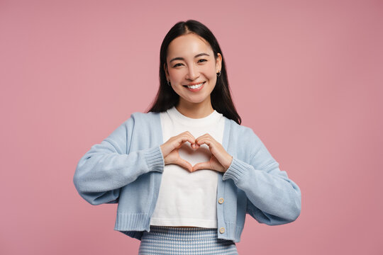Smiling, beautiful woman making heart shape with hands standing isolated on pink background