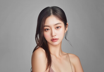 Studio shot of a beautiful Asian idol girl with healthy skin looking at the camera. Natural makeup of a beautiful model with copy space. Cosmetic concept.