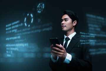 Software engineer occupation in information technology IT, analyze data, solve problems, and innovative thinking solutions. Asian Programmer using mobile phone writing virtual coding data.