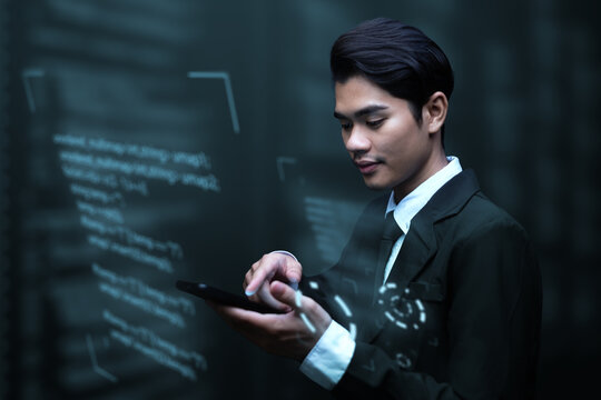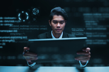 Software engineer occupation in information technology IT, analyze data, solve problems, and innovative thinking solutions. Asian Programmer using a tablet writing virtual coding data.