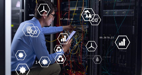 Image of eco icons and digital data processing over asian male it engineer by computer servers