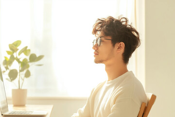 Young man with glasses sitting at desk, profile view, sunlight, plants in background