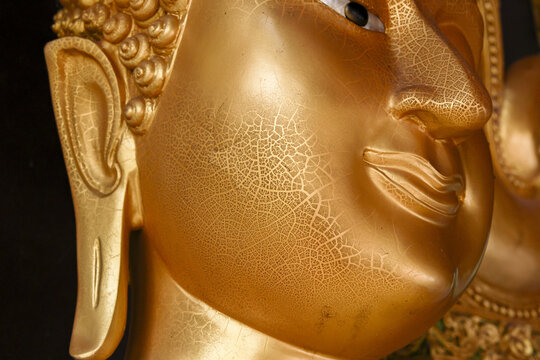 Serene close up of golden Buddha statue face. This ornate sculpture with intricate detail represents Asian religion, spirituality, and peace at traditional temple