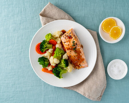 Steam salmon and vegetables, Paleo, keto, fodmap, dash diet. Mediterranean meal with steamed fish. Healthy concept, white plate on table, gluten and lectine free, top view