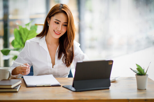 Young beautiful woman using her laptop while sitting in a chair at her working place,  Small business owner people employee freelance online sme marketing e-commerce telemarketing concept.
