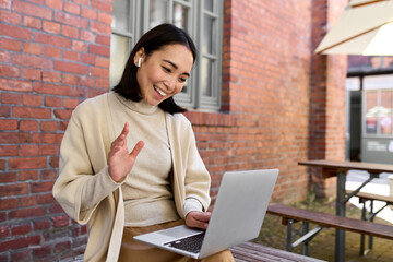 Low angle view profile side photo of asian positive education study blogger girl sit table use laptop greet coach seminar webinar waving hand in house indoors