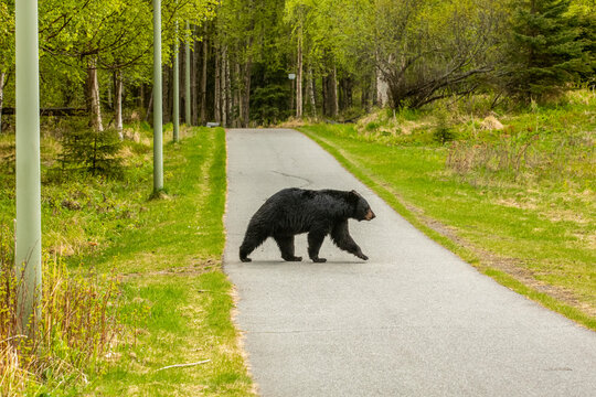 A mature Black bear (Ursus americanus) crosses a bike trail in Kincaid Park in Anchorage, South-central Alaska; Anchorage, Alaska, United States of America