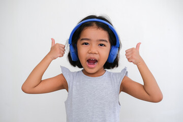 A little girl happily raised her thumbs up, listening to music on blue headphone