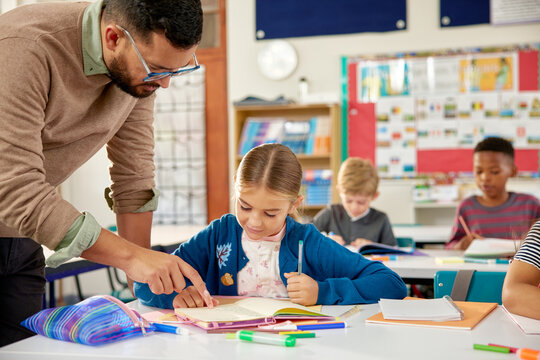 Teacher assisting young student with school assignment