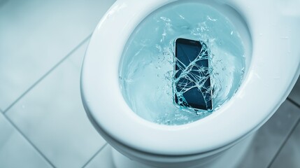 Close-up of broken, damaged smartphone or phone with cracks and scratches on the screen, submerged in water in a toilet bowl after being dropped. The damaged device requires repair at service center.