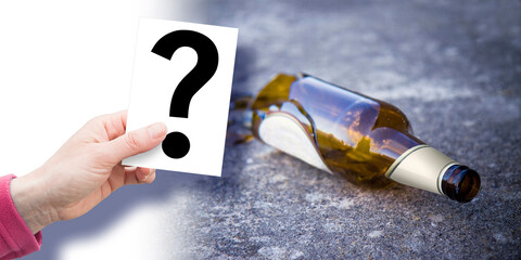 What is alcoholism? - Learn about an alcohol addiction - Doubts and uncertainties about alcoholism - concept with shattered brown beer bottle resting on the ground and question mark