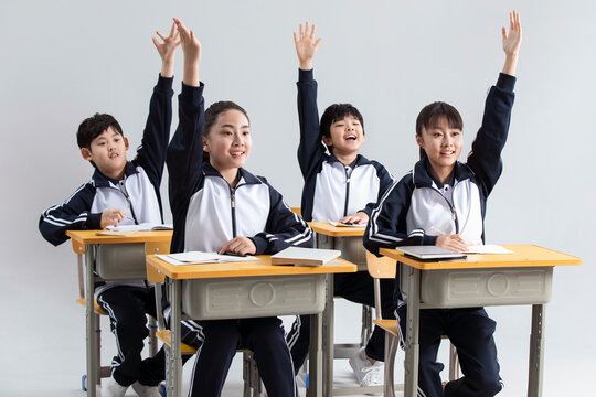 Rear view of businessman sitting in conference room on presentation with hand raised and asking a question.