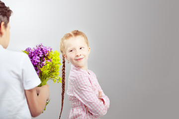 Little girl flirting with a boy with flowers