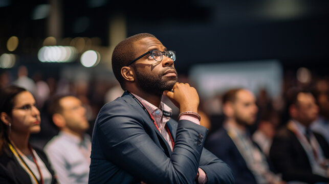 Confident black businessman. Black business man as a seminar attendee asking question while sitting in audience.