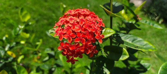 Red asoka flowers with green leaves in the garden are also useful for hedges